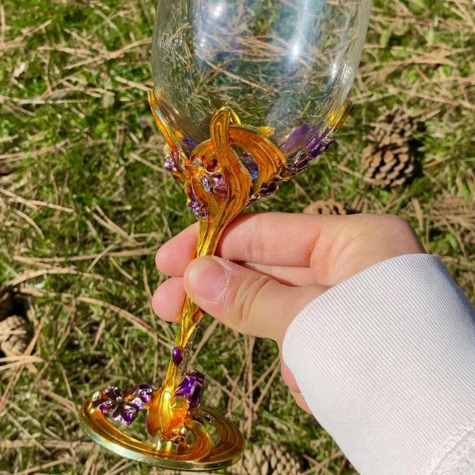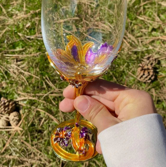 🌸 Kieliszek z kolorowym, kwiatowym detalem i złotą podstawą.